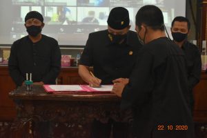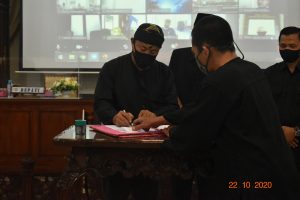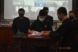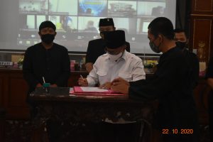 RAPAT PARIPURNA DPRD KABUPATEN KARANGANYAR MASA SIDANG I PENETAPAN NOTA KESEPAKATAN BERSAMA ANTARA PEMKAB KARANGANYAR DENGAN DPRD KABUPATEN KARANGANYAR TENTANG KEBIJAKAN UMUM ANGGARAN APBD TAHUN ANGGARAN 2021 SERTA PRIORITAS DAN PLAFON ANGGARAN SEMENTARA APBD TAHUN ANGGARAN 2021 DI RUANG RAPAT PARIPURN DPRD KABUPATEN KARANGANYAR. KAMIS, 22 OKTOBER 2020.