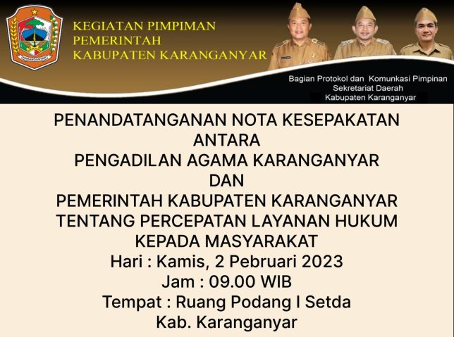 PENANDATANGANAN NOTA KESEPAKATAN oleh Sekretariat Daerah Kabupaten Karanganyar | Feb 2, 2023 | Daftar Informasi Publik, Gallery, Informasi Publik, Tak Berkategori | 0 Komentar Kirim Komentar Batalkan balasanAlamat email Anda tidak akan dipublikasikan. Ruas yang wajib ditandai *Komentar * Nama * Email * Situs Web Simpan nama, email, dan situs web saya pada peramban ini untuk komentar saya berikutnya.