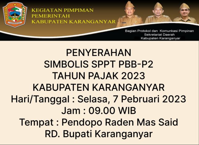 PENYERAHAN SIMBOLIS SPPT PBB-P2 TAHUN PAJAK 2023 KABUPATEN KARANGANYAR oleh Sekretariat Daerah Kabupaten Karanganyar | Feb 7, 2023 | Tak Berkategori | 0 Komentar Kirim Komentar Batalkan balasanAlamat email Anda tidak akan dipublikasikan. Ruas yang wajib ditandai *Komentar * Nama * Email * Situs Web Simpan nama, email, dan situs web saya pada peramban ini untuk komentar saya berikutnya.