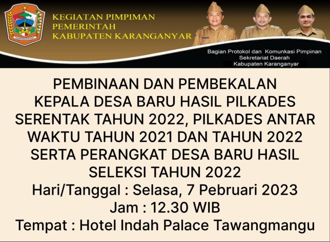 PEMBINAAN DAN PEMBEKALAN KEPALA DESA BARU HASIL PILKADES SERENTAJ TAHUN 2022, PILKADES ANTAR WAKTU TAHUN 2021 TAHUN 2022 SERTA PERANGKAT DESA BARU HASIL SELEKSI TAHUN 2022 oleh Sekretariat Daerah Kabupaten Karanganyar | Feb 7, 2023 | Berita, Gallery, Informasi Publik, Tak Berkategori | 0 Komentar Kirim Komentar Batalkan balasanAlamat email Anda tidak akan dipublikasikan. Ruas yang wajib ditandai *Komentar * Nama * Email * Situs Web Simpan nama, email, dan situs web saya pada peramban ini untuk komentar saya berikutnya.