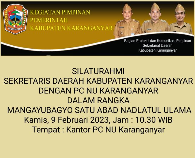SILATURAHMI SEKRETARIS DERAH KABUPATEN KARANGANYAR DENGAN PC NU KARANGANYAR DALAM RANGKA MANGAYUBAGYO SATU ABAD NADLATUL ULAMA oleh Sekretariat Daerah Kabupaten Karanganyar | Feb 9, 2023 | Agenda Pimpinan, Berita, Daftar Informasi Publik, Gallery, Informasi Publik, Tak Berkategori | 0 Komentar Kirim Komentar Batalkan balasanAlamat email Anda tidak akan dipublikasikan. Ruas yang wajib ditandai *Komentar * Nama * Email * Situs Web Simpan nama, email, dan situs web saya pada peramban ini untuk komentar saya berikutnya.