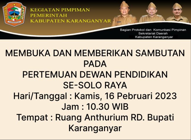 MEMBUKA DAN MEMBERIKAN SAMBUTAN PADA PERTEMUAN DEWAN PENDIDIKAN SE-SOLO RAYA oleh Sekretariat Daerah Kabupaten Karanganyar | Feb 16, 2023 | Tak Berkategori | 0 Komentar Kirim Komentar Batalkan balasanAlamat email Anda tidak akan dipublikasikan. Ruas yang wajib ditandai *Komentar * Nama * Email * Situs Web Simpan nama, email, dan situs web saya pada peramban ini untuk komentar saya berikutnya.