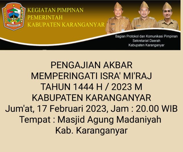 PENGAJIAN AKBAR MEMPERINGATI ISRA’ MI’RAJ TAHUN 1444 H / 2023 M KABUPATEN KARANGANYAR oleh Sekretariat Daerah Kabupaten Karanganyar | Feb 17, 2023 | Berita, Gallery, Informasi Publik, Tak Berkategori | 0 Komentar Kirim Komentar Batalkan balasanAlamat email Anda tidak akan dipublikasikan. Ruas yang wajib ditandai *Komentar * Nama * Email * Situs Web Simpan nama, email, dan situs web saya pada peramban ini untuk komentar saya berikutnya.