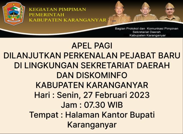 APEL PAGI DILANJUTKAN PERKENALAN PEJABAT BARU DI LINGKUNGAN SEKRETARIAT DAERAH DAN KOMINFO oleh Sekretariat Daerah Kabupaten Karanganyar | Feb 27, 2023 | Agenda Pimpinan, Berita, Daftar Informasi Publik, Gallery, Informasi Publik, Tak Berkategori | 0 Komentar Kirim Komentar Batalkan balasanAlamat email Anda tidak akan dipublikasikan. Ruas yang wajib ditandai *Komentar * Nama * Email * Situs Web Simpan nama, email, dan situs web saya pada peramban ini untuk komentar saya berikutnya.