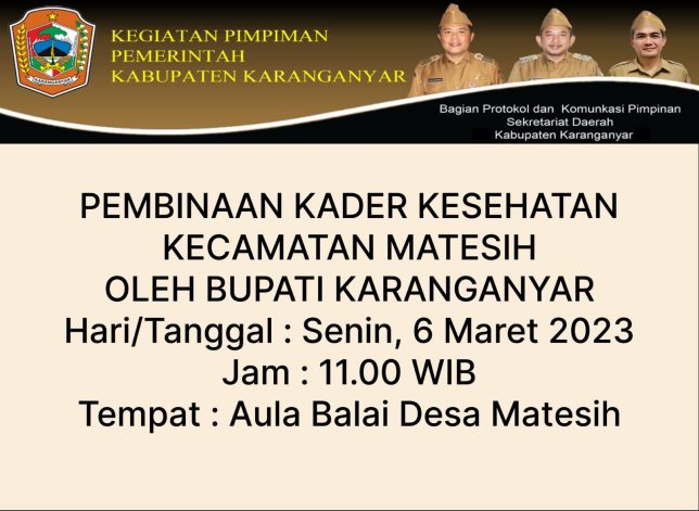 PEMBINAAN KADER KESEHATAN KECAMATAN MATESIH OLEH BUPATI KARANGANYAR oleh Sekretariat Daerah Kabupaten Karanganyar | Mar 6, 2023 | Agenda Pimpinan, Berita, Daftar Informasi Publik, Gallery, Informasi Publik, Tak Berkategori | 0 Komentar Kirim Komentar Batalkan balasanAlamat email Anda tidak akan dipublikasikan. Ruas yang wajib ditandai *Komentar * Nama * Email * Situs Web Simpan nama, email, dan situs web saya pada peramban ini untuk komentar saya berikutnya.