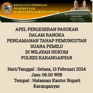 APEL PERGESERAN PASUKAN DALAM RANGKA PENGAMANAN TAHAP PEMUNGUTAN SUARA PEMILU DI WILAYAH HUKUM POLRES KARANGANYAR oleh Sekretariat Daerah Kabupaten Karanganyar | Feb 13, 2024 | Agenda Pimpinan, Berita, Daftar Informasi Publik, Gallery, Informasi Publik | 0 Komentar