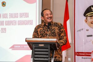 Bupati Karanganyar, H. Rober Christanto, S.E., M.M. bersama Wakil Bupati Karanganyar, H. Adhe Eliana, S.E. menghadiri kegiatan pembahasan hasil evaluasi Rancangan Peraturan Daerah (Raperda) tentang Rencana Pembangunan Jangka Menengah Daerah (RPJMD) Kabupaten Karanganyar Tahun 2025–2029 yang digelar pada hari Rabu, 6 Agustus 2025 di Eboni Ballroom, Hotel Gets Premier, Semarang.