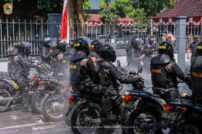 Dalam simulasi diperagakan skenario unjuk rasa yang meningkat menjadi aksi anarkis, dengan penanganan bertahap mulai pendekatan persuasif hingga pengendalian massa secara profesional.