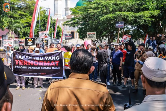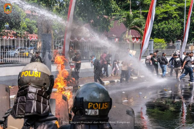 Bupati Karanganyar H. Rober Christanto, S.E., M.M. dan Wakil Bupati Karanganyar H. Adhe Eliana ,SE, didampingi jajaran pejabat Polres Karanganyar, menyaksikan simulasi kesiap-siagaan aparat dalam menghadapi potensi aksi demonstrasi di depan Kantor Bupati Karanganyar, Senin (25/8/2025).